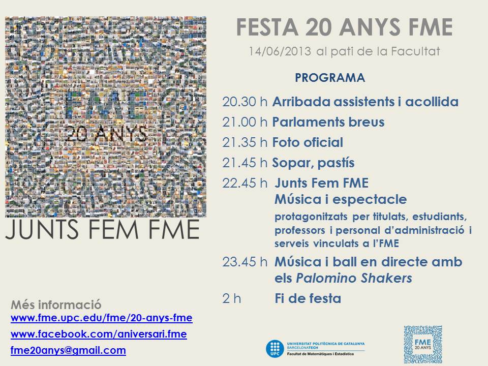 Ho celebrarem amb una festa en què ens puguem trobar tots els qui en algun moment hem estat vinculats a l’FME durant aquests anys: estudiants, titulats, professors, personal d’administració, amics...